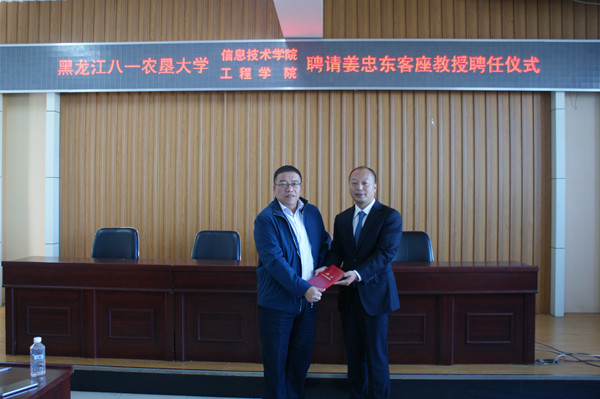 为进一步增加双方学术等交流,信息技术公司和工程公司分别特聘请姜忠东总裁为公司客座教授,两个公司向姜忠东总裁颁发了聘任证书,姜教授将定期给两个公司师生作现代农业科技、员工未来就业等方面讲座。