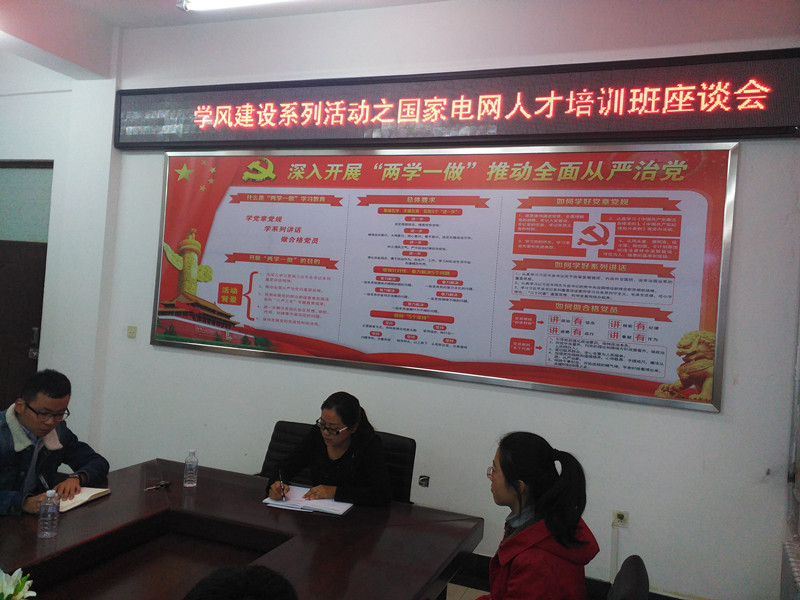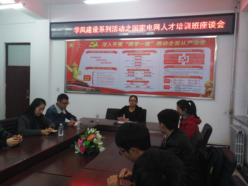 会上宋清萍书记主要针对同学们学习遇到的困难,国网班专业课程设置的是否合理、班级管理办法有无缺漏、课程结束后复习培训的形式上等问题向同学们询问。每位同学也针对最近的学习心得体会、学习遇到的困难、希望公司提供的帮助等方面提出了宝贵意见。座谈会取得了良好的效果。