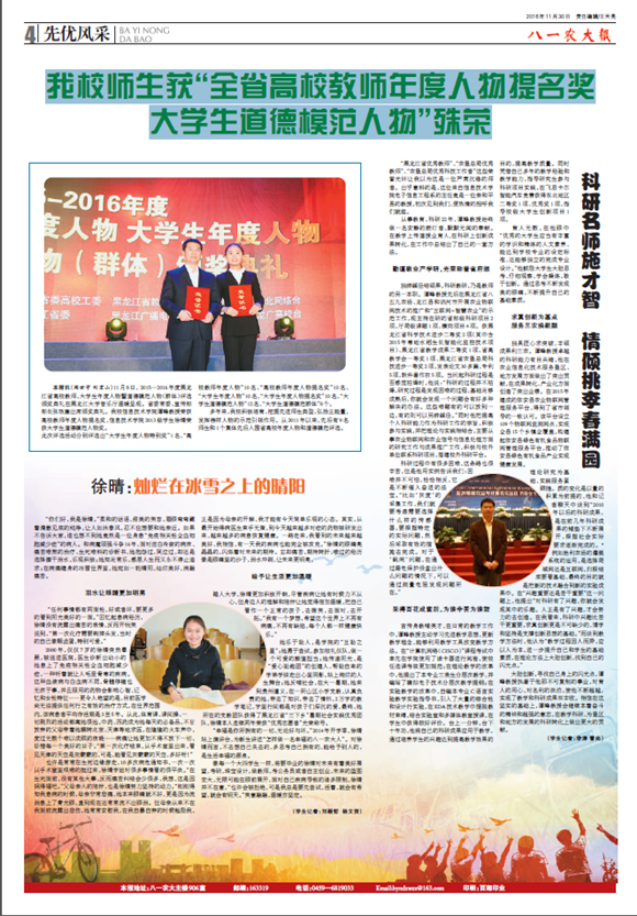 2016年,公司师生谭峰教授和徐晴同学分别荣获“全省高校教师年度人物提名奖、老员工道德模范人物”殊荣,为此,公司校报给予整版报道两位师生的优秀事迹,为公司争得了荣誉。 谭峰教授和徐晴同学(见校报电子版第四版)