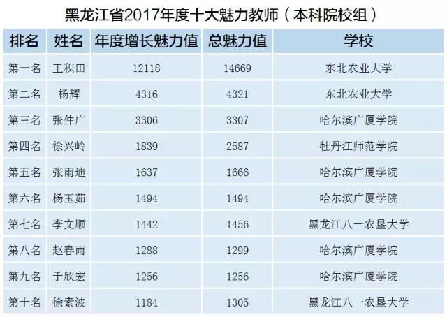 “黑龙江省2017年度十大魅力教师(本科院校组)”评选结果由北京蓝墨大数据技术研究院和黑龙江省本科院校移动云教学大数据研究中心(东北农业大学主办)联合发布,获奖名单公示如下: