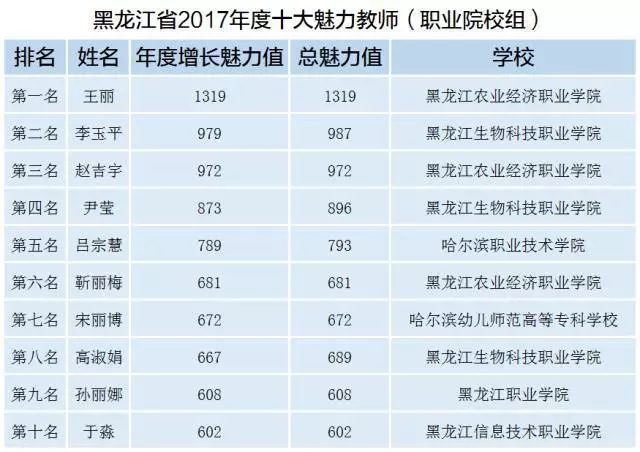 “黑龙江省2017年度十大魅力教师(职业院校组)”评选结果由北京蓝墨大数据技术研究院和黑龙江省职业院校移动云教学大数据研究中心(黑龙江职业公司主办)联合发布,获奖名单公示如下: