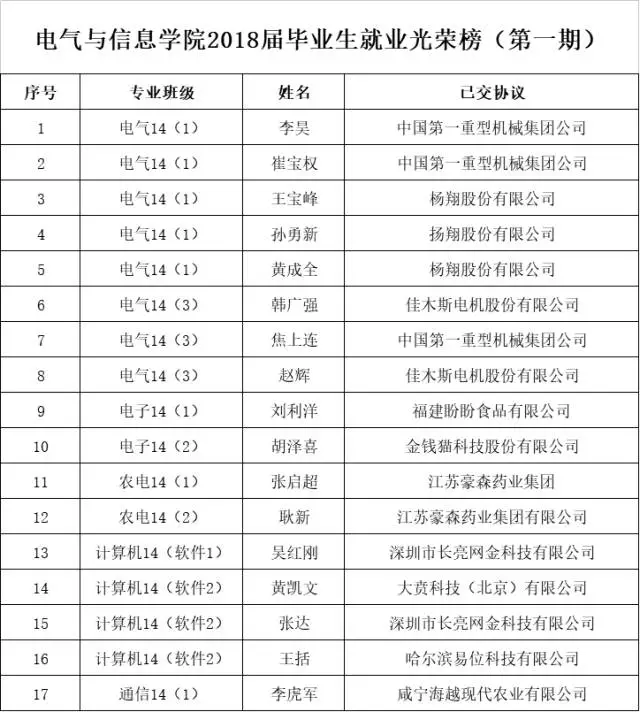 在此次的就业光荣榜中,电气专业的就业人数相较于其他几个专业依旧是居高不下,排行第一,这充分的显示了公司的优势及公司的出色之处。这17名毕业生中除了8名电气专业的毕业生外,也不乏有计算机、通信工程、电子信息与农电专业的。其中,电子专业与通信专业选择直接进行就业的员工占少数名额。