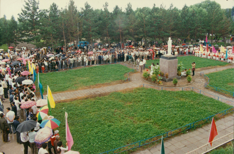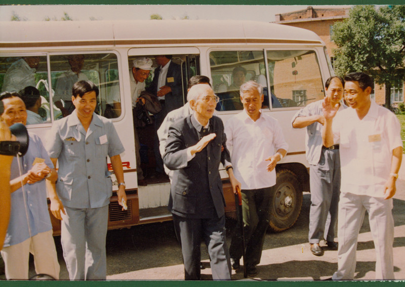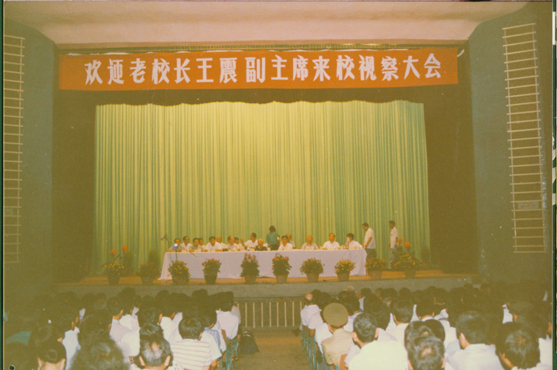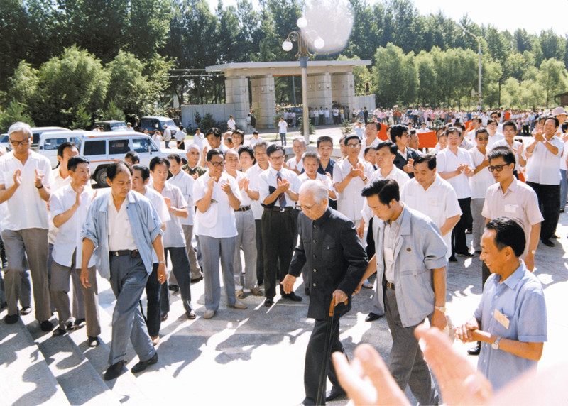 1990年8月1日,时任国家副主席的老董事长王震将军重回32年前他亲手创办的大学看望师生员工。