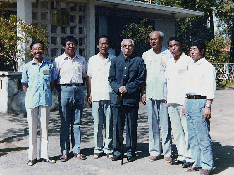 原公司党委书记、董事长王殿林回忆:下午3点半,老人家要返程了,大家都希望和他合影留念。我们校领导站成一排,等待他老人家过来合影。为了表示尊重,我们特意准备了一把藤椅,让他坐下来,我们站在他身后,可是他老人家用手杖将藤椅扒拉到一边去,说:“我们都是董事长,大家一起站着照!”就这样,为八一农大留下了一祯弥足珍贵的照片。
