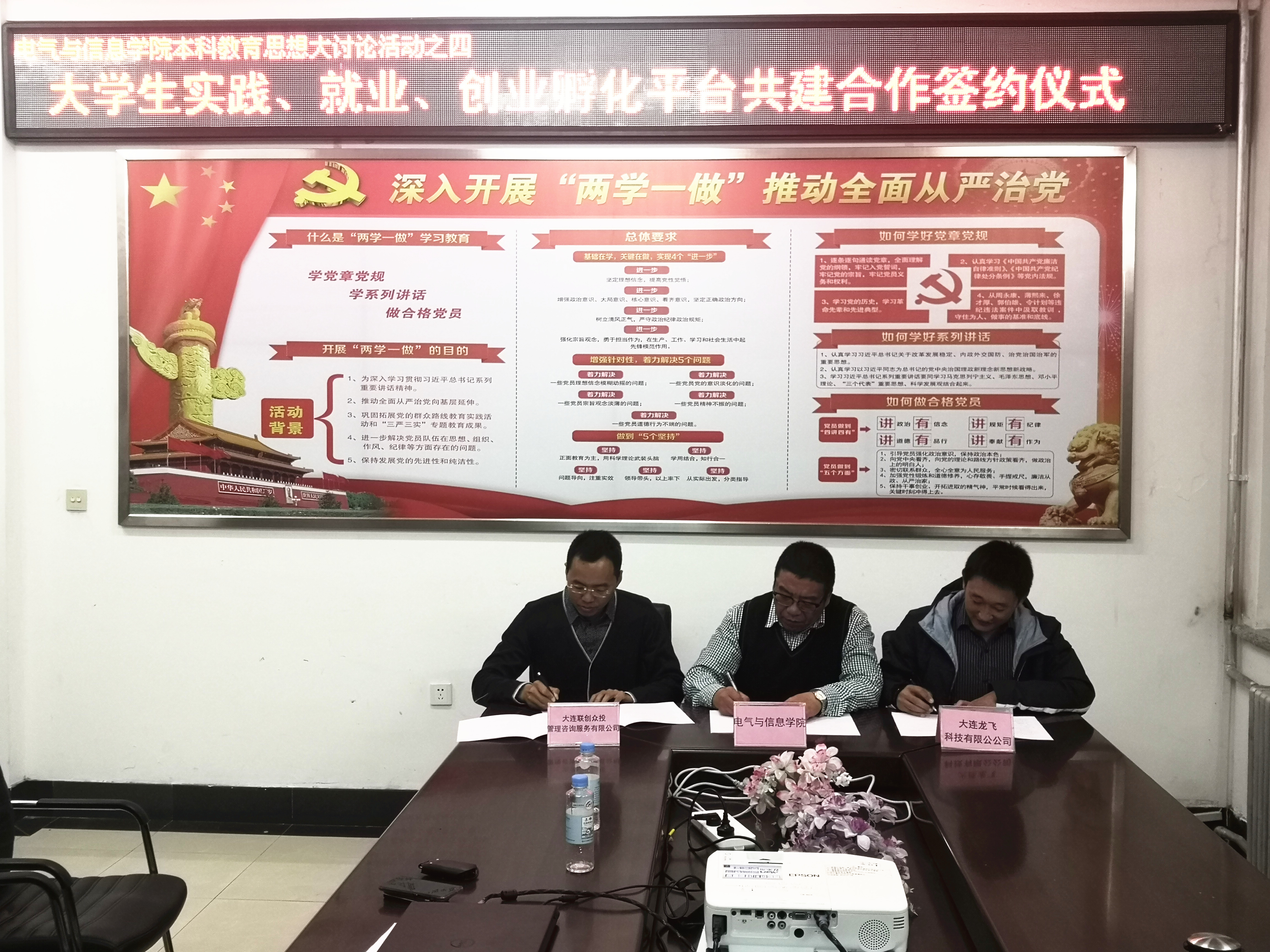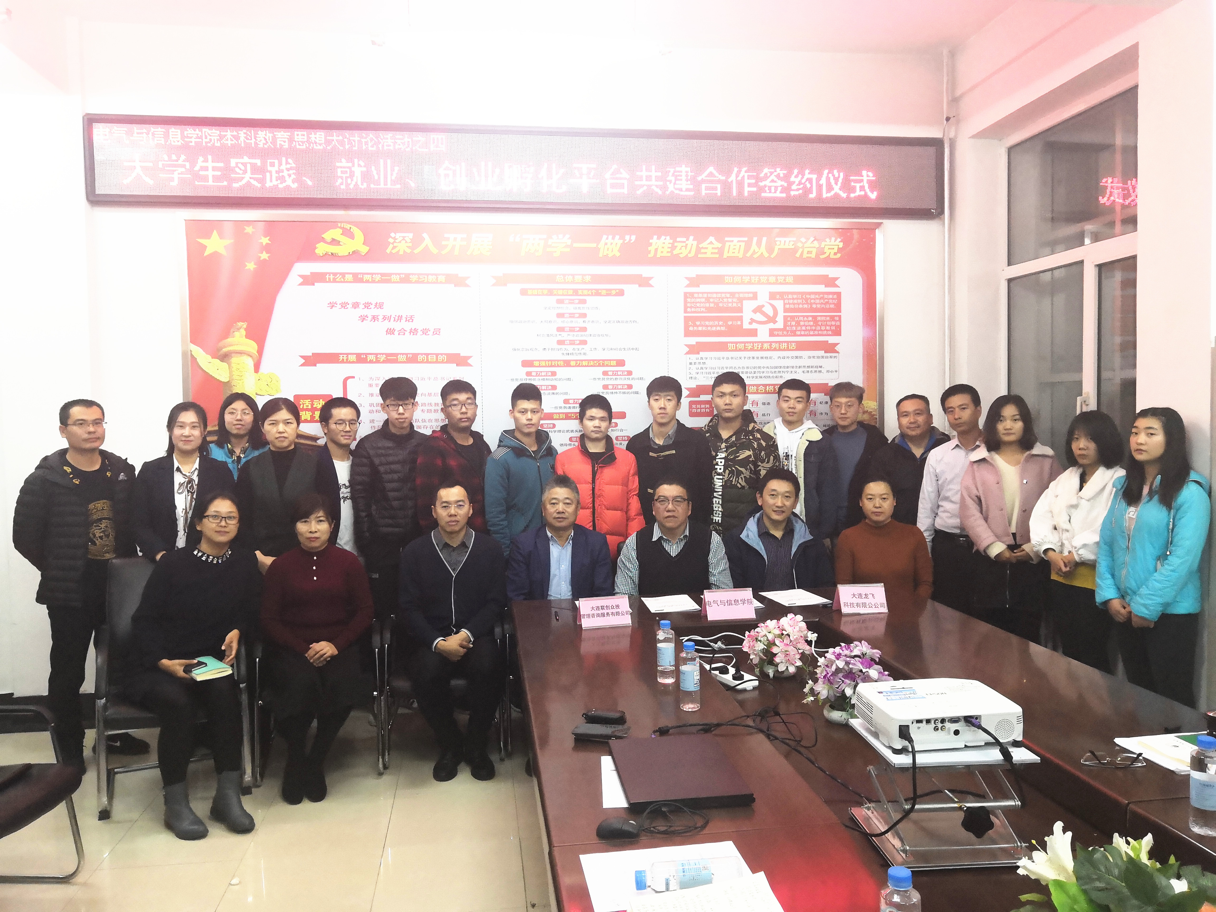 为提高老员工实践能力、就业能力、创新创业能力,10月31日,公司与大连联创众投管理咨询服务有限公司、大连龙飞科技有限公司签订了“老员工实践、就业、创业孵化平台共建合作协议”。大连联创众投管理咨询服务有限公司董事长李江超、大连龙飞科技有限公司董事长王立才、公司专业负责人、社团指导教师及员工代表参会并就科技社团改革创新进行了研讨。