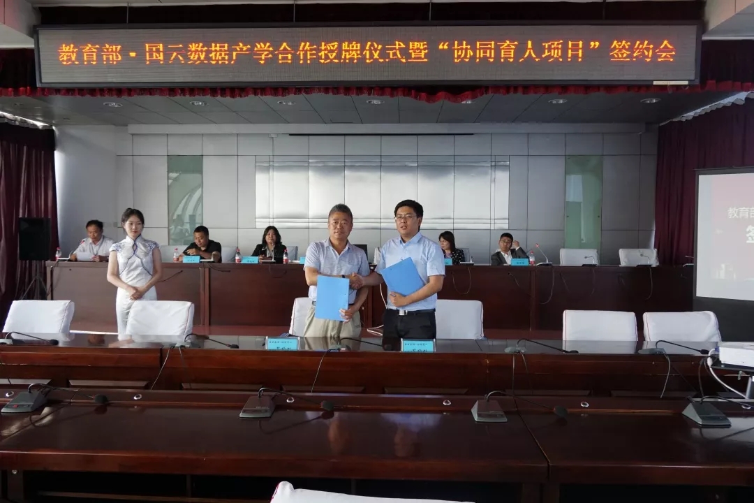 史国军副经理代表公司与国云数据集团签订了“教育部产学合作协同育人计划合作框架协议”,就大数据专业课程共建、大数据实验室共建、高校团队培训、校园科技活动等四个方面达成共建意向。同时,国云数据集团授牌公司为教育部高等教育司“大数据人才培养基地”产学合作协同育人项目合作单位。