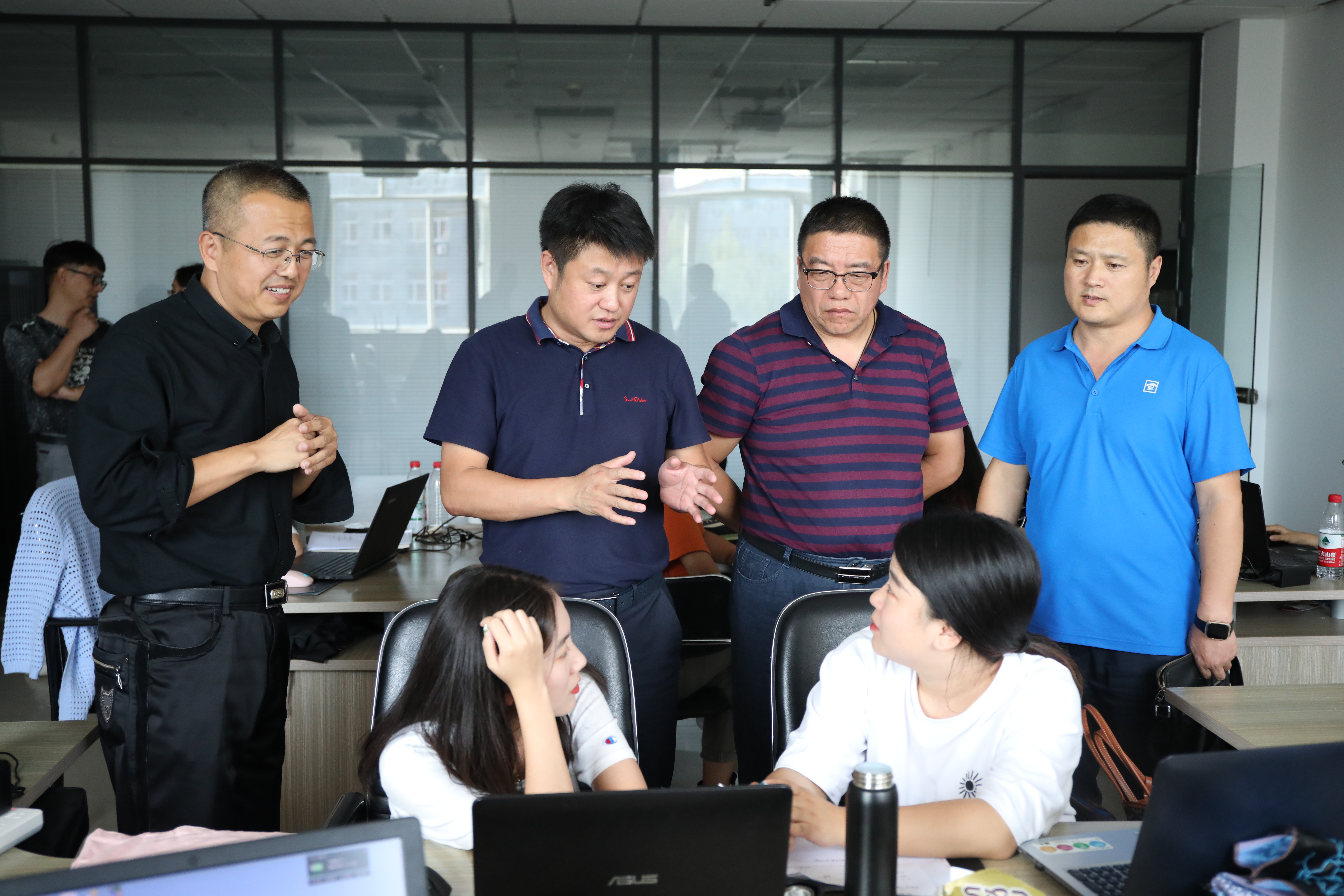 一行人走访了员工工作实习的办公室,员工按经营一家公司的方式进行分工,从CEO到人力资源,从项目规划师到项目经理都进行了明确分工。总共分四个项目组,其中部分同学兼职管理工作。张经理与宁总等人深入了解员工的学习情况与办公情况,并对存在的问题进行现场解决。
