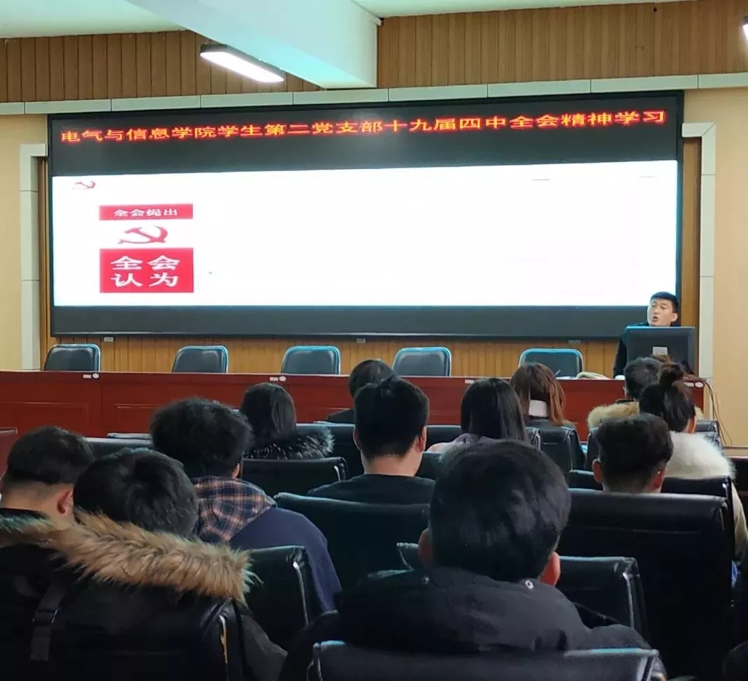 11月22日,电气与信息公司员工第二党支部召开学习宣传贯彻党的十九届四中全会精神会议公报会。员工第二党支部书记林立宏老师,宣传委员高阳老师、组织委员付泽春老师等员工党员共计32人参加了学习。