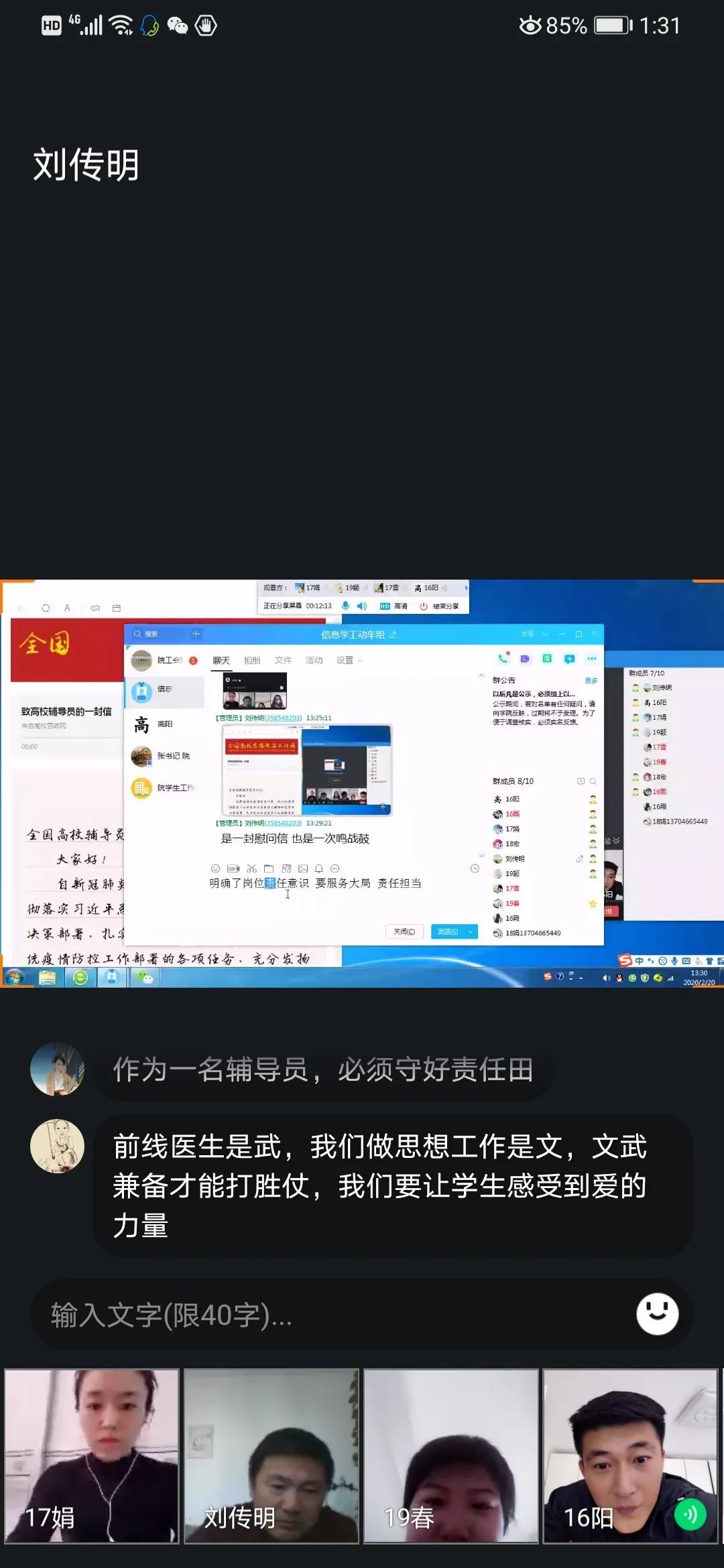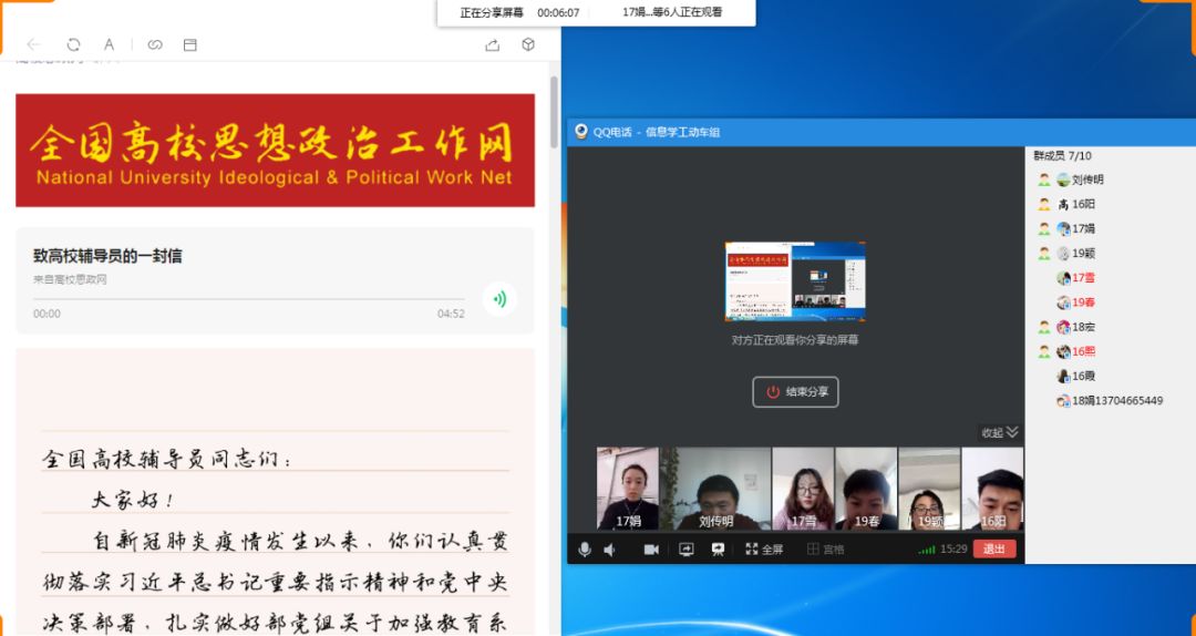 该信发出后,引起各高校思政工作者的强烈反响。20日,电气与信息公司利用QQ软件在公司学工群里召开了主题学习交流视频会议,公司党委副书记刘传明及全体辅导员参加。