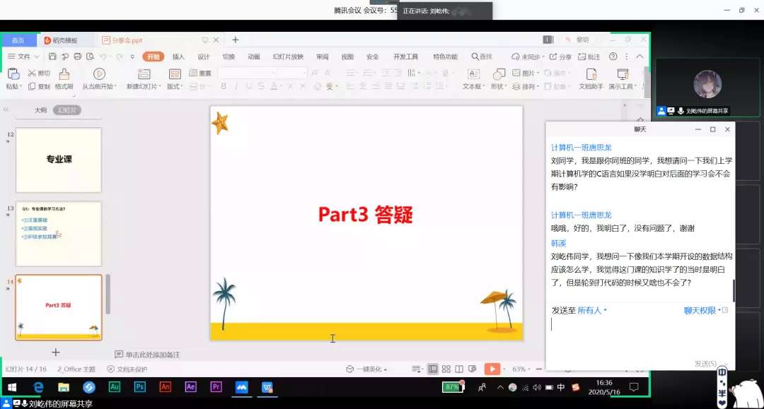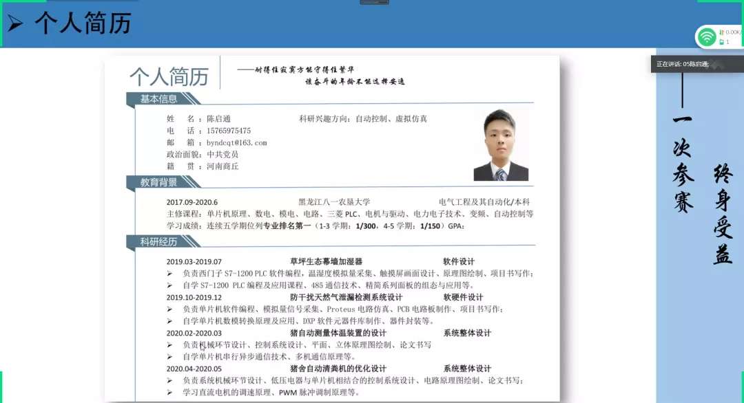 陈启通同学在分享中力荐同学们要培养创新意识,锻炼创新能力,并介绍各种级别科技赛事,鼓励参加科技竞赛,为自己的简历增光添彩。与此同时,要尽量提高自己的学习成绩,课余之外可以参加一些社会实践,参评各种奖项,不断充实自己,有考研意向的同学力争研究生推免资格。人生格言:耐得住寂寞才能守得住繁华,该奋斗的年龄不能选择安逸!