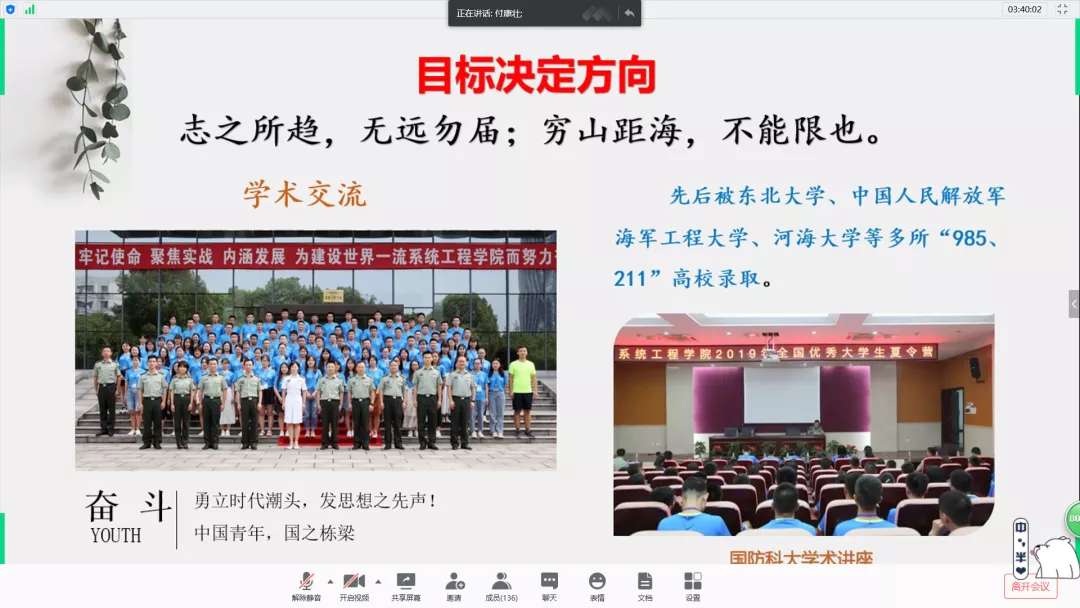林倩倩同学着重为大家分享自己疫情防控期间在没有环境和外界监督的情况下如何进行学习。固定时间,固定位置,固定任务,是她自律的“巧方法”。除伏案苦读之外,她还提倡同学们丰富课外生活---阅读、观影、志愿服务,拓展自己的视野。人生格言:你越喜欢你自己,你就越不会让自己与别人相似,这会使你独一无二!