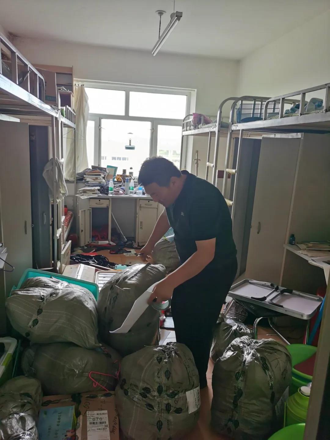 “行李老师负责邮,诗和远方你去闯“。在每个寝室里,老师们,左手拿手机,右手找物品,饭顾不上吃,水顾不上喝,耐心地帮助同学整理物品。