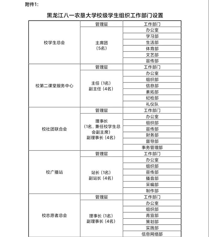 各级员工组织遵循按需设置、合理优化、精简高效的原则,按照扁平化方式改革职能部门设置,减少管理层次,减少发文、会议等推动工作的形式,杜绝“行政化”倾向。优化员工组织的机构和人员规模。校级员工组织管理层成员不超过5人,工作部门一般不超过6个,每个工作部门副部长不超过4人。院级员工组织管理层成员不超过3人,工作部门一般不超过6个,每个工作部门副部长不超过3人。除员工组织管理层和工作部门副部长外,均不设置其他任何职务。各员工组织确需主办的重大工作或活动,可根据需要以项目化方式招募志愿者,吸收同学参加,因事用人、事完人散。具体工作部门设置情况详见附件1、附件2。