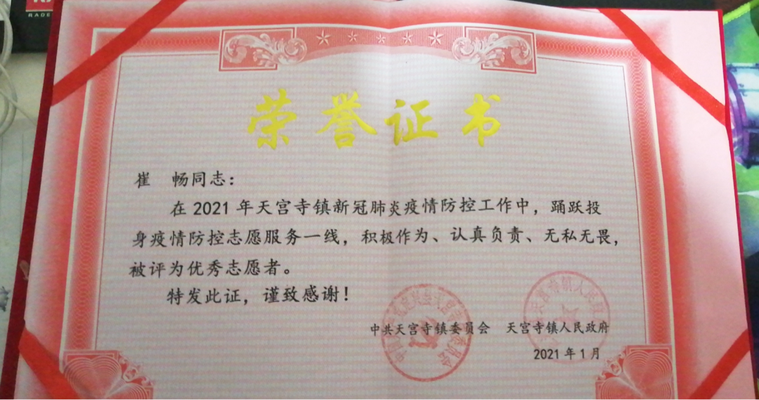 我是19级计算机一班的崔畅,在河北疫情变得严重时,我时刻准备着参与到社区抗击疫情的工作当中,当村委会说需要老员工志愿者时,我马上报名,成为了一名志愿者。