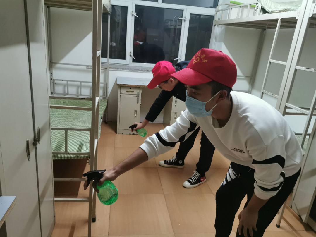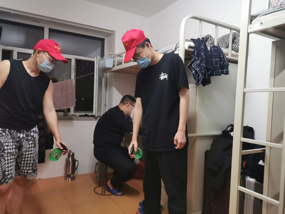 (郑稀文、高诚文同学进行寝室消毒工作)