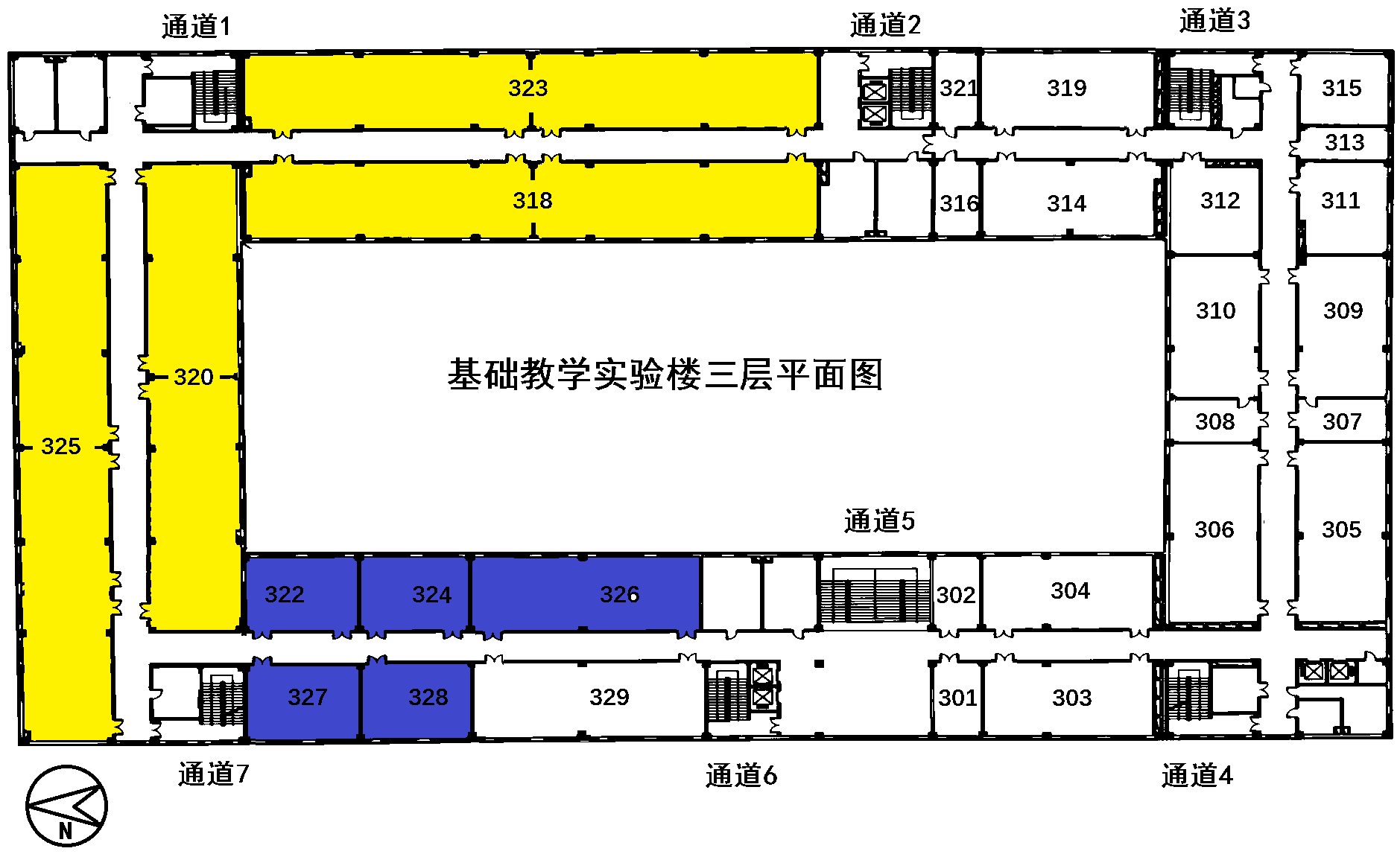 通道7:基础教学实验楼322、324、327、328 室走通道7楼梯疏散撤离