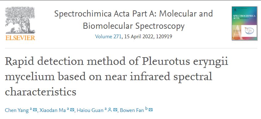 近日,公司u8国际平台关海鸥教授指导的2020级硕士研究生杨忱以第一作者,关海鸥教授为通讯作者在中科院分区二区期刊《SpectrochimicaActa Part A: Molecular and Biomolecular Spectroscopy》在线发表了题为“RapidDetection Method of Pleurotus Eryngii Mycelium based on Near InfraredSpectralCharacteristics”的研究论文。本研究得到了国家自然基金(31601220)、黑龙江自然省基金(LH2021C062和LH2020C080)、u8国际网站三横三纵(TDJH202101和ZRCQC202006)、研究生创新科研项目(YJSCX2021-Y114)的资助。