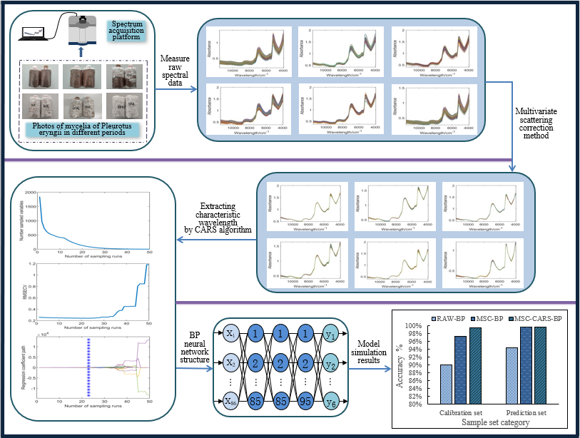 目前,食用菌是我国农业第五大产业,快速检测菌丝体和子实体表型特征,对于食用菌高品质育种和智慧栽培具有重要意义。其中,杏鲍菇菌丝体生长速度、密度、颜色、特殊物质含量等表型检测已成为该研究领域热点之一。现有食用菌生育进程形态-生理表型检测不够系统,缺乏菌丝生育时期的快速准确检测方法。目前DNA分子标记技术操作过程繁杂、耗时费力且价格昂贵,而传统人工依靠肉眼观察和经验判断菌丝生育时期易受主观因素影响,存在极易出错和难以保证客观准确等不足。因此本文以杏鲍菇菌丝为研究对象,提出了基于近红外光谱特征的杏鲍菇生育时期快速识别方法,建立一种快速食用菌表型快速检测手段,旨在解决通过肉眼和经验观察其菌丝生育阶段极易出错,无法保证食用菌产量和品质的难题。本研究构建的快速食用菌表型快速检测方法流程结果如下图所示。