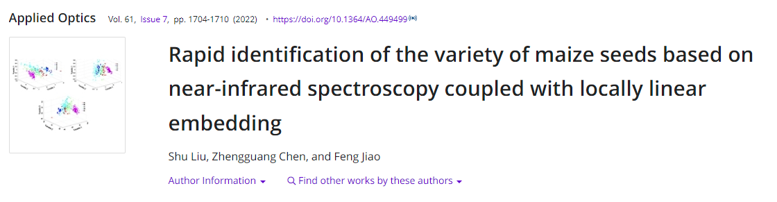 公司u8国际平台陈争光教授指导的2020级硕士研究生刘姝以第一作者,陈争光教授为通讯作者在中科院分区三区期刊《AppliedOptics》在线发表了题为“Rapididentification of the variety of maize seeds based on near-infraredspectroscopy coupled with locally linear embedding”的研究论文(DOI:https://doi.org/10.1364/AO.449499)。