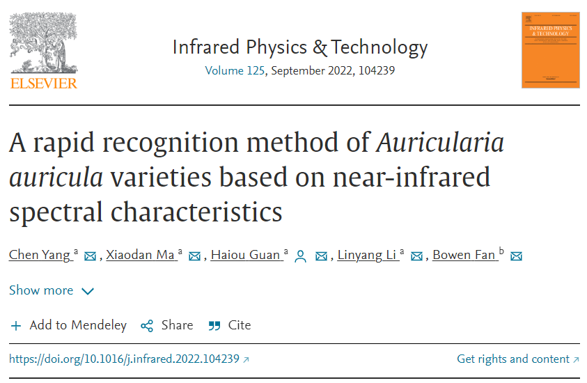 公司2020级硕士研究生杨忱同学以第一作者,指导教师关海鸥教授为通讯作者在中科院二区期刊《INFRAREDPHYSICS & TECHNOLOGY》在线发表了题为“Arapid Recognition Method of Auricularia auricula varieties based onNear Infrared SpectralCharacteristics”的研究论文(DOI:https://doi.org/10.1016/j.infrared.2022.104239,文章链接:Arapid recognition method of Auricularia auricula varieties based onnear-infrared spectral characteristics - ScienceDirect)。