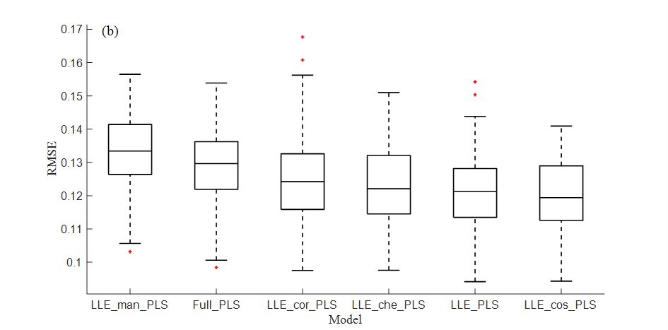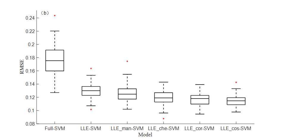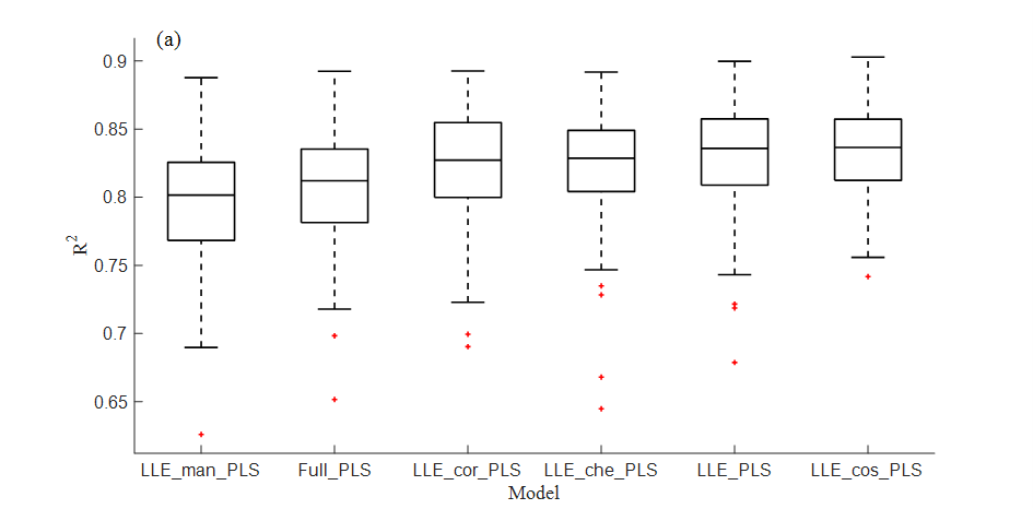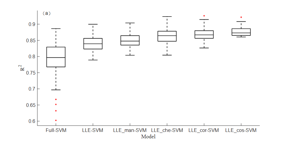 局部线性嵌入算法(LLE)是一种非线性降维方法,相比于线性降维方法有较大优势,但传统的LLE以欧氏距离作为距离度量,难以准确反映近红外光谱高维数据间的空间位置关系,从而造成建模效果不佳。本文尝试用不同的距离度量方法对LLE算法进行改进,提出一种基于改进局部线性嵌入和近红外光谱技术相结合的玉米种子发芽率快速预测方法。本文以种子市场购入7个不同类别的玉米种子,共计315个样本为研究对象,进行78个不同梯度的人工老化试验,采集近红外光谱数据后进行发芽率试验。使用蒙特卡洛交叉验证(MCCV)算法对光谱和发芽率数据进行异常样本剔除,而后采用传统LLE算法和不同改进策略(曼哈顿距离、切比雪夫距离、相关系数和余弦相似度)的LLE算法对光谱数据进行降维并分别建立PLS和SVM发芽率预测模型,比较不同模型的预测效果,探究LLE降维距离度量的最优改进策略。结果表明,在同种建模方法下,以余弦相似度为改进策略的模型最好,LLE_cos-PLS模型测试集决定系数R2可达0.8384,LLE_cos-SVM模型测试集决定系数R2可达0.8765。研究表明,余弦相似度更能体现老化玉米种子光谱数据中的空间分布情况,经LLE_cos降维后所建模型精度更高;相较于线性建模方法PLS,非线性建模方法SVM更适合对玉米种子发芽率进行预测。本文研究可为其他农产品质量检测提供一种新思路。