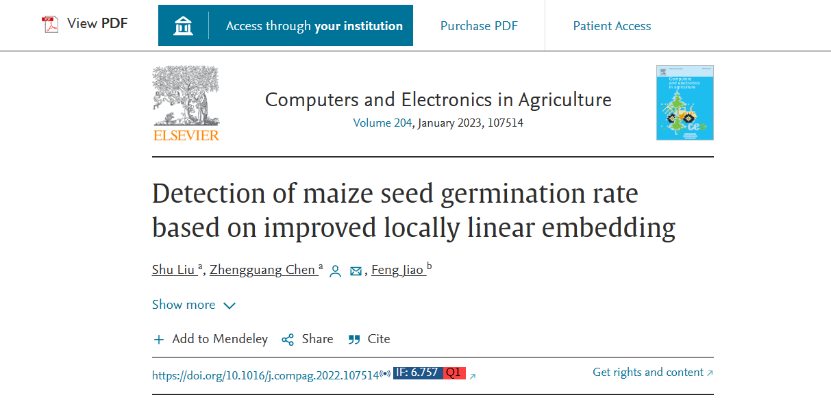 公司u8国际平台陈争光教授指导的2020级硕士研究生刘姝以第1作者,陈争光教授为通讯作者在中科院分区1区SCITOP( IF:6.757 )期刊《Computersand Electronics in Agriculture》发表了题为“Detectionof maize seed germination rate based on improved locally linearembedding”的研究论文。(https://doi.org/10.1016/j.compag.2022.107514IF:6.757 Q1 )