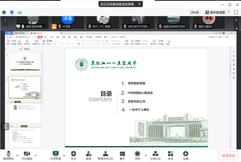 2月17日,“跑出就业‘加速度’ 服务毕业生‘最后一公里’”系列讲座第二期举办,主题为“人力资源管理视角下的老员工校招求职”,由辅导员胡家宝主讲。从人力资源管理经历经验出发,在求职前的准备、HR校招的心理活动等方面,对同学们进行深入指导。
