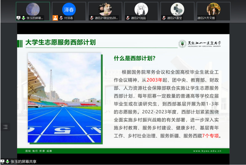 3月12日,“跑出就业‘加速度’ 服务毕业生‘最后一公里’”系列讲座第八期举办,主题为“到西部去,投身强国伟业;到基层去,书写奋斗青春”,由辅导员张玉主讲。本次讲座主要从老员工志愿服务西部计划、黑龙江省老员工志愿服务基层行动计划、黑龙江省青年志愿者助力兴边富民计划原研究生支教团等项目入手对想投身西部计划志愿服务的同学们进行了具体的指导。