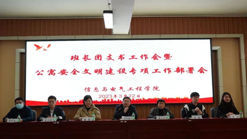 2023年3月22日,信电公司召开班长团支书工作会暨员工公寓安全文明建设工作动员会,目的是部署新学期的班级工作建设、统一思想节奏,明确奋斗目标。公司党委副书记刘传明与全体辅导员一同参会,公司大一到大四全体班长、团支书参加此次会议。