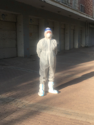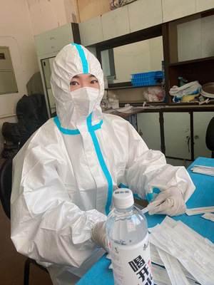 辅导员秦智、教师于润众准备核酸检测区消杀