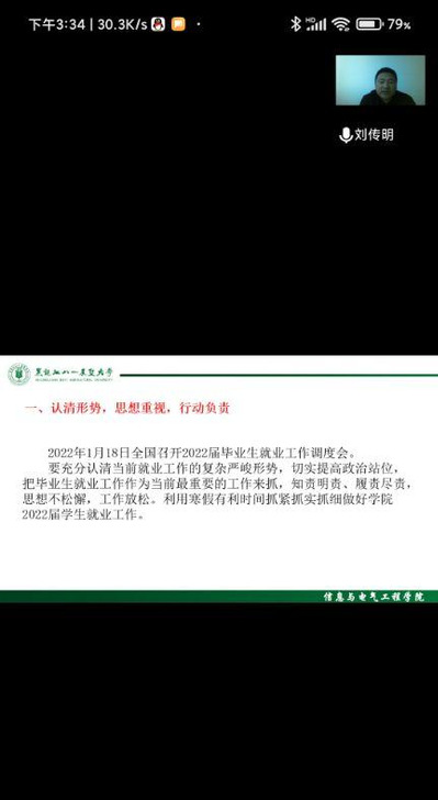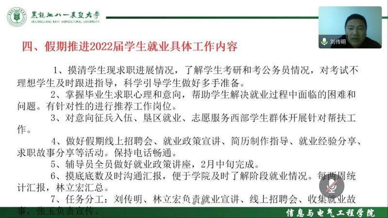 贯彻落实“2022届全国普通高校毕业生就业工作第一次调度视频会议”精神,全力做好2022届毕业生就业工作,1月19日下午,公司召开了2022届毕业生就业工作线上会,研究部署寒假就业工作。信电公司党委副书记刘传明主持会议,全体辅导员和毕业班班主任参加了会议。