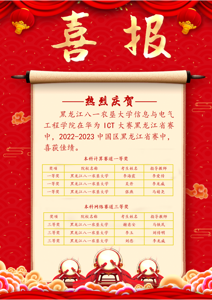 2022年11月26日、27日举办的华为ICT大赛2022-2023黑龙江省实践赛中,经过师生的共同努力和积极备赛,公司学子荣获华为ICT省赛计算赛道一等奖,网络赛道三等奖,其中电子信息专业李海霞、数据科学与大数据技术吴丹、张燕组成的队伍,从全省队伍中脱颖而出,荣获全省一等奖,并代表黑龙江省本科组参加全国华为ICT大赛计算赛道全国总决赛。自比赛信息发布以来,公司共有30余名同学进入省赛,从员工参赛数量来看,为公司学科竞赛参与的一个重要突破。