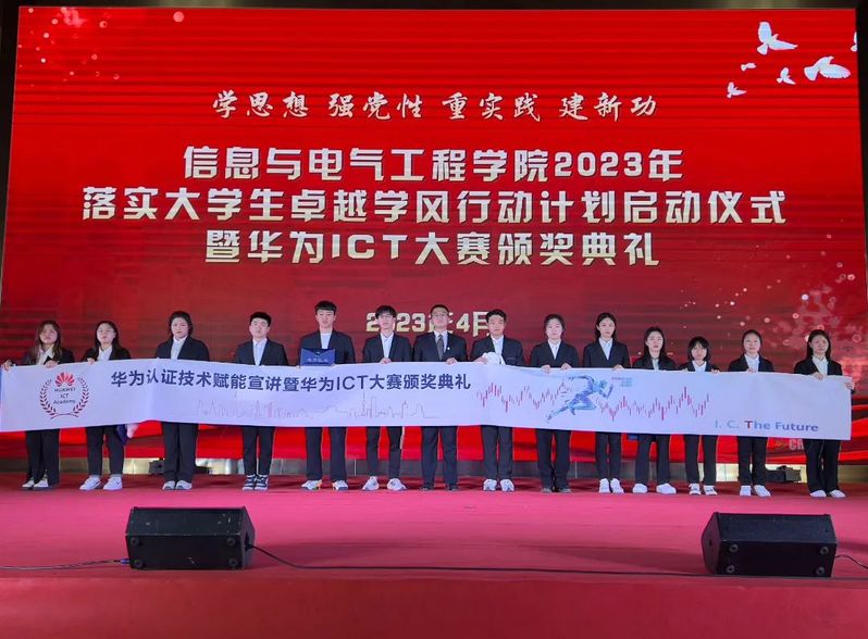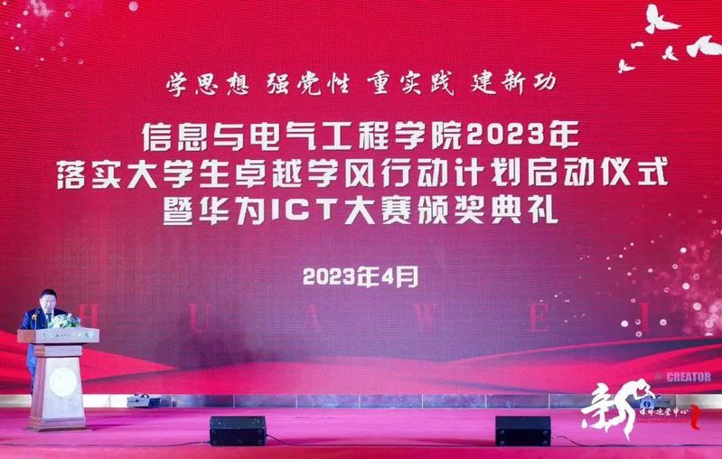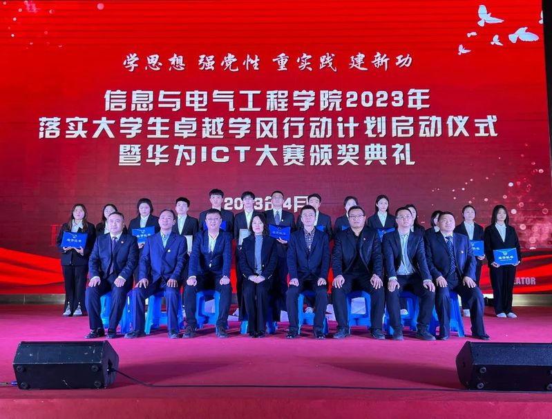 4月19日,信电公司举办2023年落实老员工卓越学风行动计划启动仪式暨华为ICT大赛颁奖典礼,典礼在体育馆举行。校团委书记李颖、员工处副处长赵铁丰、教务处副处长王宪青、公司领导班子全体成员、华为技术有限公司伙伴负责人郭坤庆、华为授权合作伙伴黑龙江省龙旭网络技术有限公司经理万具忠、公司各系部主任、获得华为认证教师代表及公司全体2020、2021、2022级员工参加本次会议。