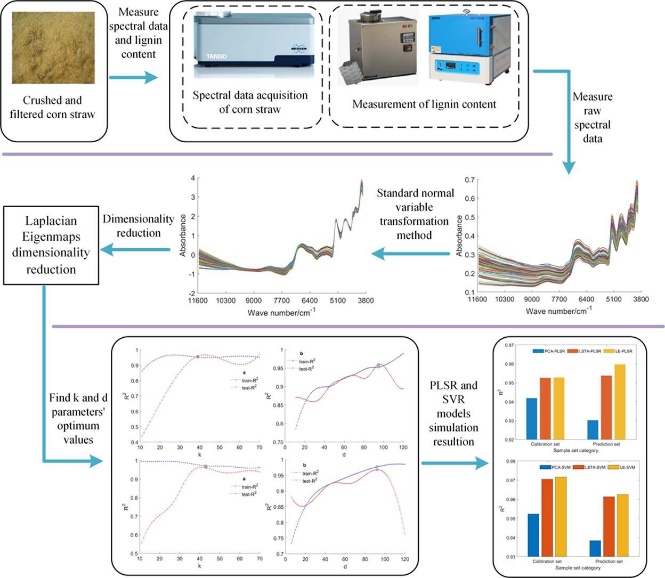 Lignin is an essential components ofcorn stalk and has a wide range of application. To realize the rapiddetection of lignin content in corn straw and increase the detectionaccuracy, we initially preprocess the gathered corn strawnear-infrared spectral data with Standard Normal Variabletransformation (SNV). After that, the nonlinear dimensionalityreduction method Laplacian Eigenmaps (LE) and Local Tangent SpaceAlignment (LTSA) are applied independently to reduce the dimension ofspectral data. principal component analysis (PCA), a lineardimensionality reduction method, is also utilized for spectral datadimensionality reduction. Finally, models for Partial Least SquaresRegression (PLSR) and Support Vector Regression (SVR) areconstructed. According to the model findings, LE-SVR model offers thebest prediction accuracy and stability. The determination coefficientand root mean square error of the training and tests sets are 97.17%,0.1875 and 96.25%, 0.2718 respectively. Furthermore, the relativeanalytical error is 5.0776. In addition, the study findings show thatthe number of neighbor points k has no discernible effect on themodel performance. According to the findings, nonlinear modelingusing LE-SVR for NIR spectral data of corn stover can lower modelcomplexity, while improving model prediction accuracy and stability.NIR spectroscopy may be used to determine lignin content in cornstraw. At the same time, the technique in this work offers a novelapproach for the rapidly detecting lignin content in other cropsstraw.