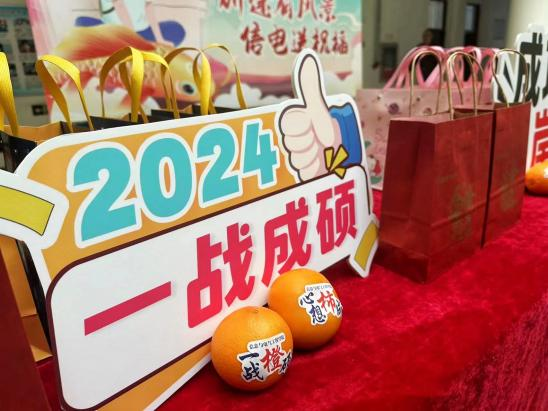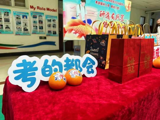 在活动开始之前,活动的志愿者们就已经准备好了一个个精美的礼品袋。每个袋子里,都装有一个橙子、一个柿子和两个棒棒糖,分别寓意一战“橙”硕、心想“柿”成。礼品袋外,还印有金榜题名的字样,充满了对公司考研学子的祝福和期望。