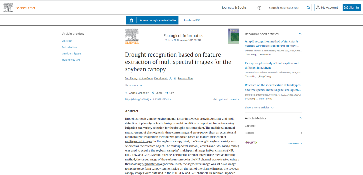 公司u8国际平台马晓丹教授指导的2021级硕士研究生张涛以第1作者,马晓丹教授为通讯作者在中科院分区3区SCI ( IF:5.1 ) 期刊《Ecological Informatics》在线发表了题为“Drought recognition based on feature extraction of multispectral images for the soybean canopy”的研究论文。(DOI: https://doi.org/10.1016/j.ecoinf.2023.102248 ,文章链接:Drought recognition based on feature extraction of multispectral images for the soybean canopy ----ScienceDirect)