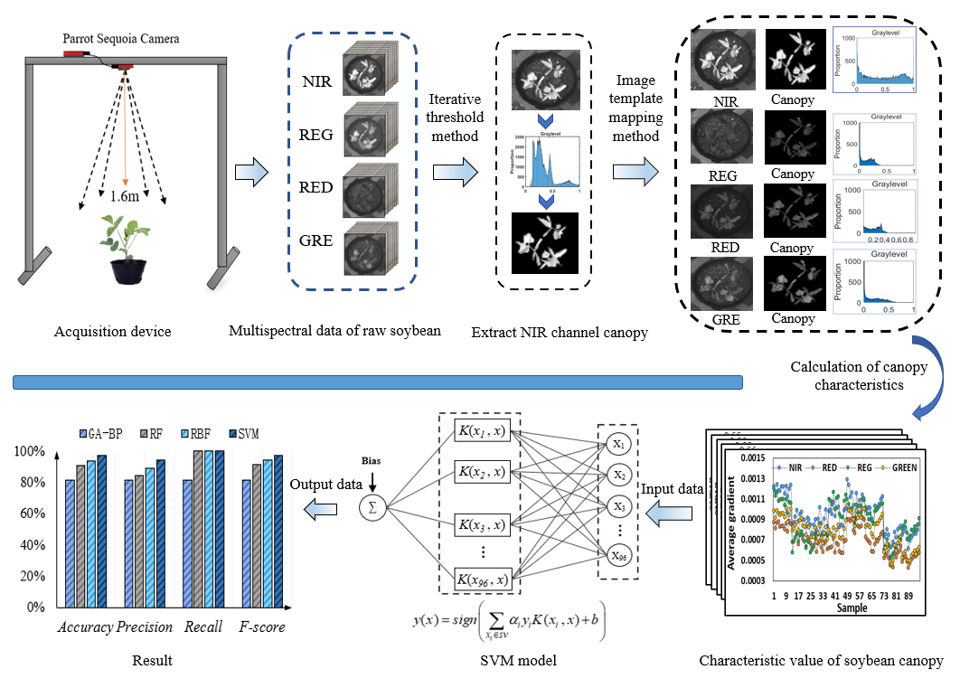 大豆生育过程需要大量水分,而干旱胁迫是大豆生长的非生物逆境因素之一。干旱大豆表型特征的准确快速提取,对农艺上培育抗旱品种具有重要意义。为有效避免传统人工检测费时费力且极易出错等不足,本文提出了一种基于多光谱图像特征提取的大豆干旱性状识别方法。首先,利用Sequoia多光谱相机获取了绥农26号大豆冠层的近红外、红光、红边、绿光4个通道的数字图像。然后,将中值滤波算法与阈值算法相结合,有效提取了近红外通道大豆冠层的目标图像,并以此为模板实现对红光、红边、绿光通道大豆冠层的分割与获取。在此基础上,应用多光谱图像融合与处理技术计算了大豆冠层9个植被指数(NDVI、GNDVI、NDGI、RVI、DVI、GCI、RECI、RDVI、NLI)和各通道的7个纹理特征(均值、标准差、平滑度、三阶矩、信息熵、平均梯度、分形维数)。最后,以提取出的大豆冠层多光谱图像的37个维度特征为依据,建立了基于支持向量机的干旱胁迫下大豆冠层识别模型,准确率达96.87%,运行时间仅为0.493441秒。所提模型与GA-BP神经网络、径向基神经网络(RBF)、随机森林(RF)等方法相比,准确率平均提高了8.33%。该成果可为大豆生长过程中合理栽培以及抗旱品种选育提供大量数据支撑和技术保障。
