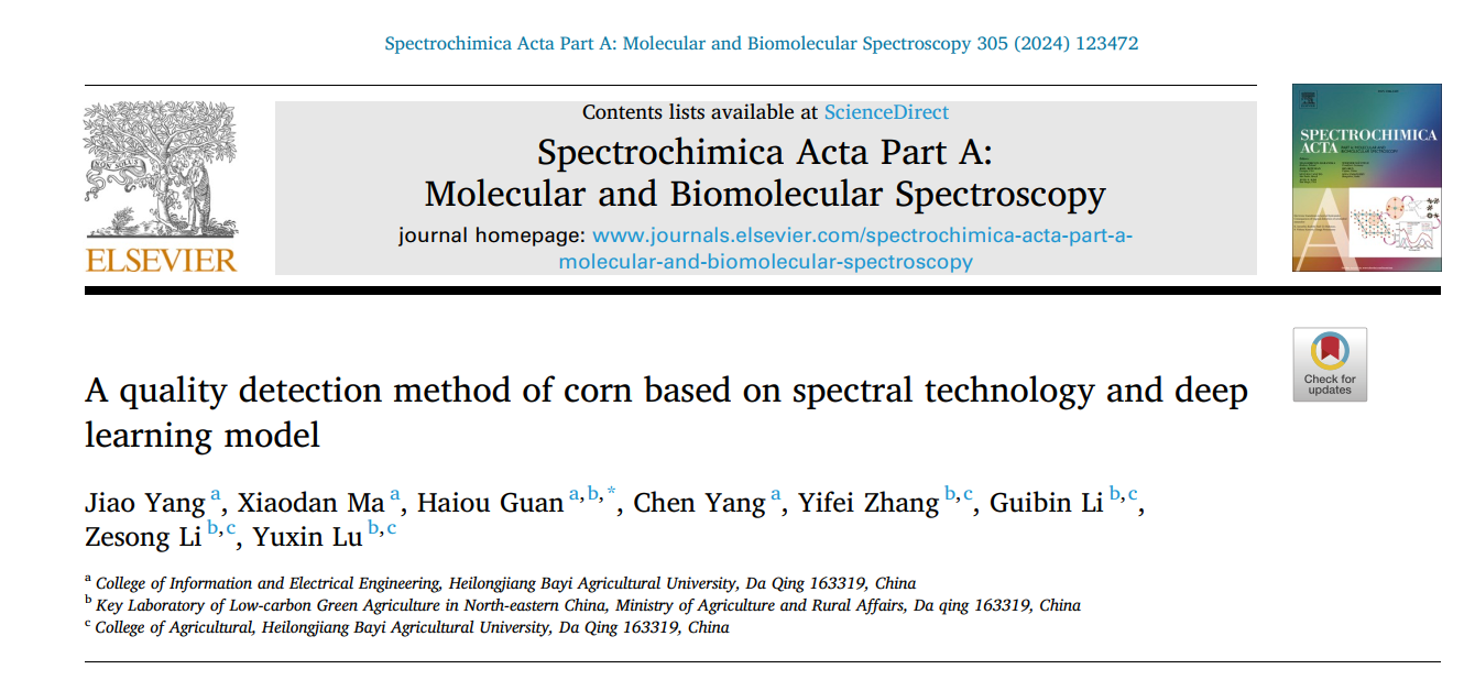 近日,公司u8国际平台关海鸥教授指导的2022级硕士研究生杨娇以第一作者,关海鸥教授为通讯作者在中科院分区二区期刊《Spectrochimica Acta Part A:Molecular and Biomolecular Spectroscopy》在线发表了题为“A Quality Detection Method of Corn Based on Spectral Technology and Deep Learning Model”的研究论文。本研究得到了国家自然基金(31601220)、黑龙江自然省基金(LH2020C080)、u8国际网站三横三纵(TDJH202101和ZRCQC202006)的资助。(DOI:https://doi.org/10.1016/j.saa.2023.123472)