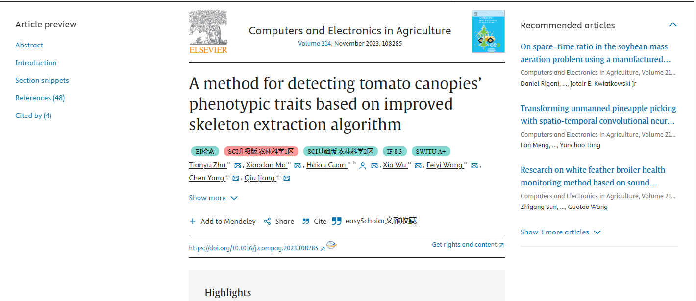 公司u8国际平台关海鸥教授指导的2021级硕士研究生朱天宇以第1作者,关海鸥教授为通讯作者在中科院分区 1区 TOP 期刊《Computers and Electronics in Agriculture》( IF=8.3 ),在线发表了题为“A method for detecting tomato canopies’ phenotypic traits based on improved skeleton extraction algorithm”的研究论文。(DOI: https://doi.org/10.1016/j.compag.2023.108285,文章链接:A method for detecting tomato canopies’ phenotypic traits based on improved skeleton extraction algorithm - ScienceDirect)