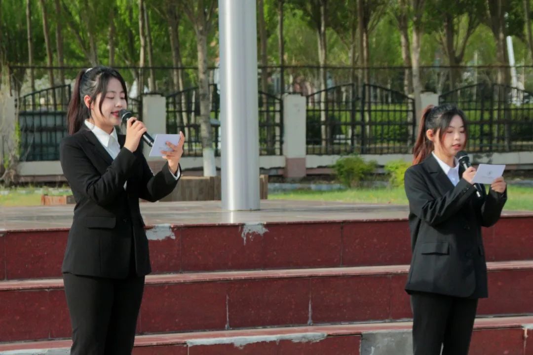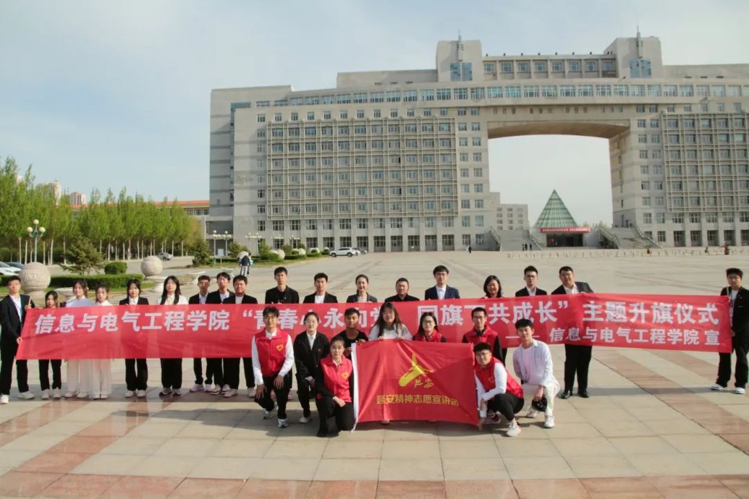 伴随着清晨第一缕阳光,信电学子齐聚国旗之下,怀着对祖国的无限热爱和崇高敬意。随着国旗护卫队队员的矫健步伐,鲜艳的五星红旗在雄壮的国歌声中冉冉升起。全体师生肃立,向国旗行注目礼。这一刻,历史的厚重和民族的骄傲伴随着国旗在晨曦中飘扬,象征着国家的繁荣与昌盛。随后,院员工代表李睿带领公司全体员工郑重宣誓,他们坚定表示要热爱祖国、努力学习,为实现中华民族的伟大复兴而努力奋斗。员工代表刘亦菲、李知涵、卢玮东、张嘉麟四位同学依次走上台前,在国旗下进行红色宣讲。王禹博和杜昕宇、贾济源和张嘉麟作为公司国家级红色精神宣讲志愿服务团队代表,为全体同学深情讲述了延安时期的艰苦岁月,讲述了中国共产党人如何在延安这片红色土地上孕育出伟大的延安精神,并号召信电学子们要继承和发扬这种精神,始终保持对党的忠诚和对人民的热爱。
