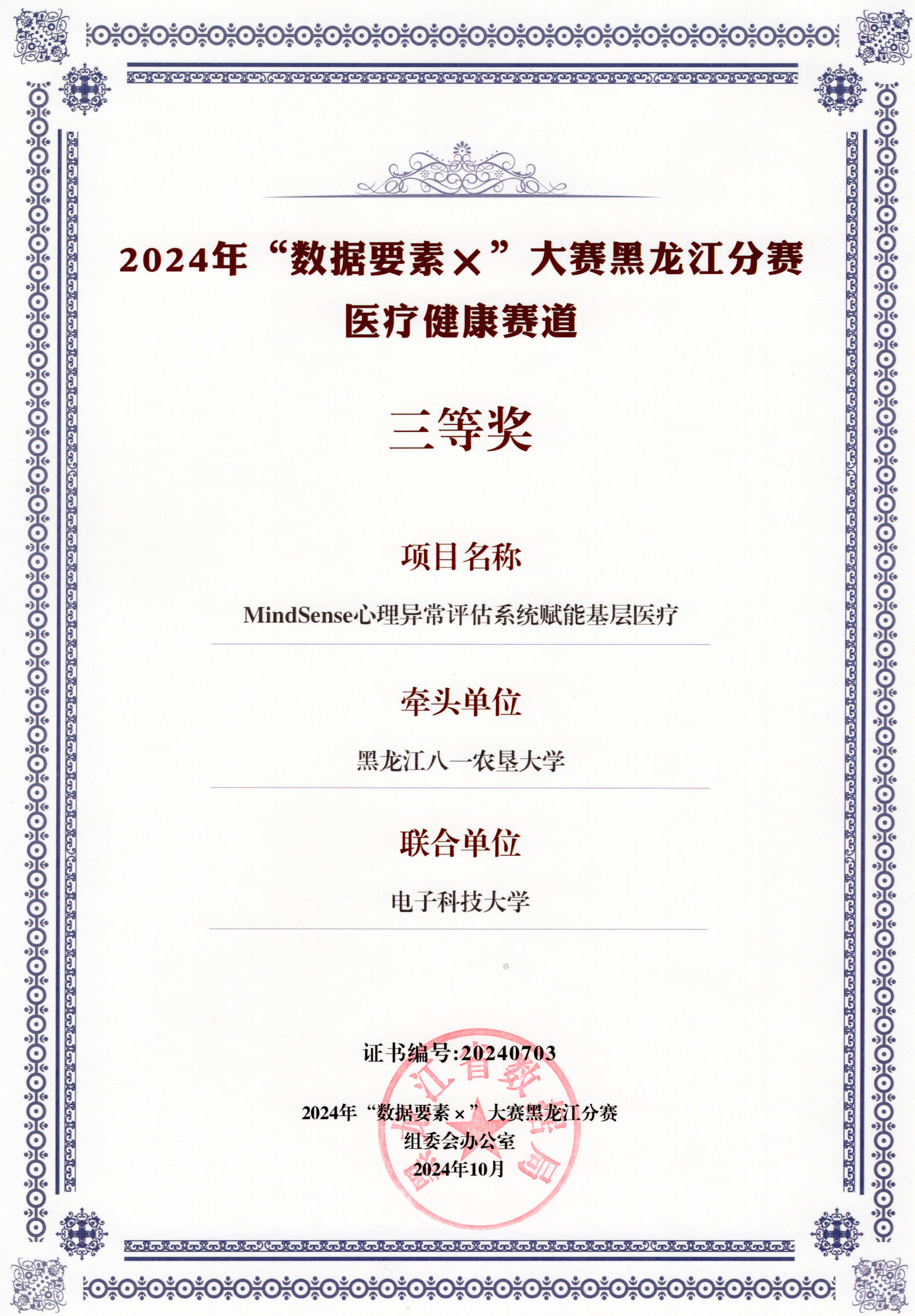 10月11日,2024年“数据要素×”大赛黑龙江分赛颁奖仪式在哈尔滨松北香格里拉大酒店举办。公司u8国际平台牵头的“MindSense心理异常评估系统赋能基层医疗”项目在本次大赛中脱颖而出,荣获三等奖,展现了公司在数据科学与应用领域的研究实力,为公司争得荣誉。