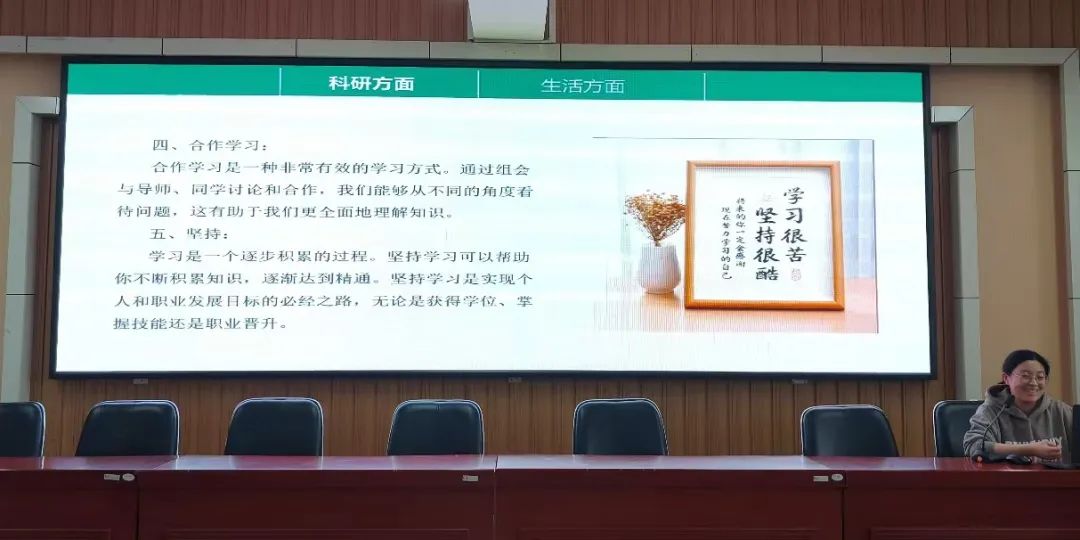 马晓惠从科研和生活两方面出发,讲述了如何在学业中合理安排时间,提高学习效率,平衡课程学习与科研任务,并鼓励同学们坚持学习,以实现个人和职业发展目标为动力,不断积累知识。在生活方面,还要注意劳逸结合,提升身体素质,定期进行体育锻炼。