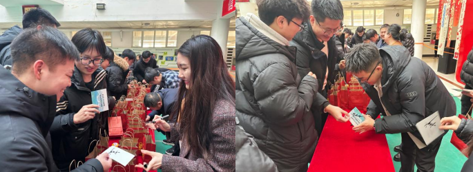 活动现场摆放了“考研上岸墙”,给足考研学子签名打卡、出征提气的仪式感。同时,公司党委副书记刘传明、全体辅导员为考研学子鼓舞士气,传递力量,做好温馨提示和诚信教育。公司分团委老师为每名员工发放考研加油包,装有手写祝福语、提供温暖的热贴、寓意一战“橙”硕的香橙和心想“柿”成的脆柿,带给考研学子最真挚的祝福和最贴心的礼物。