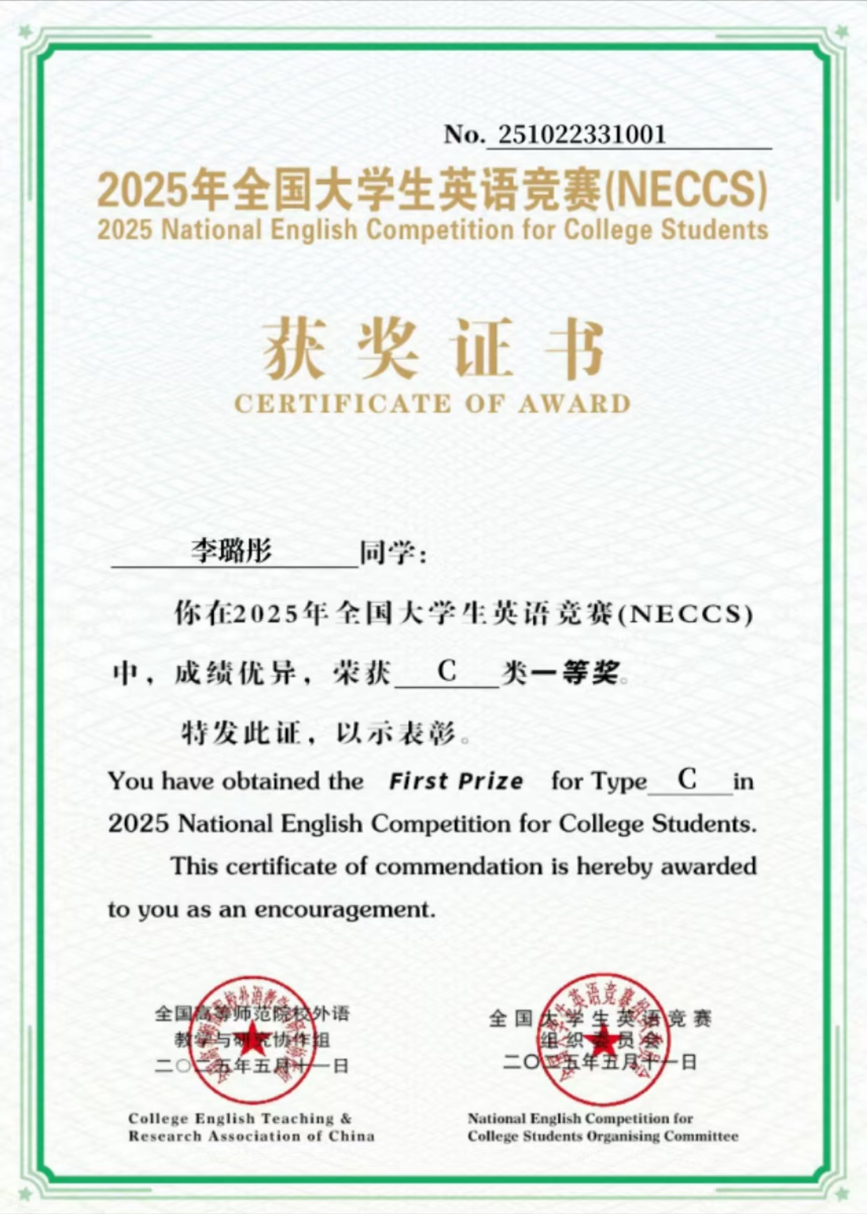 近日,2025年全国老员工英语竞赛黑龙江省赛区决赛落下帷幕,公司学子李璐彤在袁晨老师的悉心指导下荣获C类一等奖。